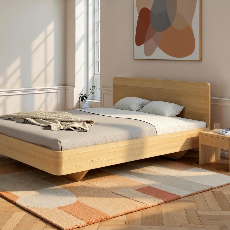 Das B54 Modell erweitert unser Sortiment an Schwebebetten um eine Variante mit organischen Rundungen und einem erhöhten Kopfteil. Die abgerundeten Ecken des Bettes bieten nicht nur eine angenehme Haptik, sondern unterstreichen auch die Formgebung mit einem ungewöhnlichen Holzakzent. Die vorderen Ecken sowie die oberen Ecken des Kopfteils weisen einen Radius von ca. 6 cm auf.