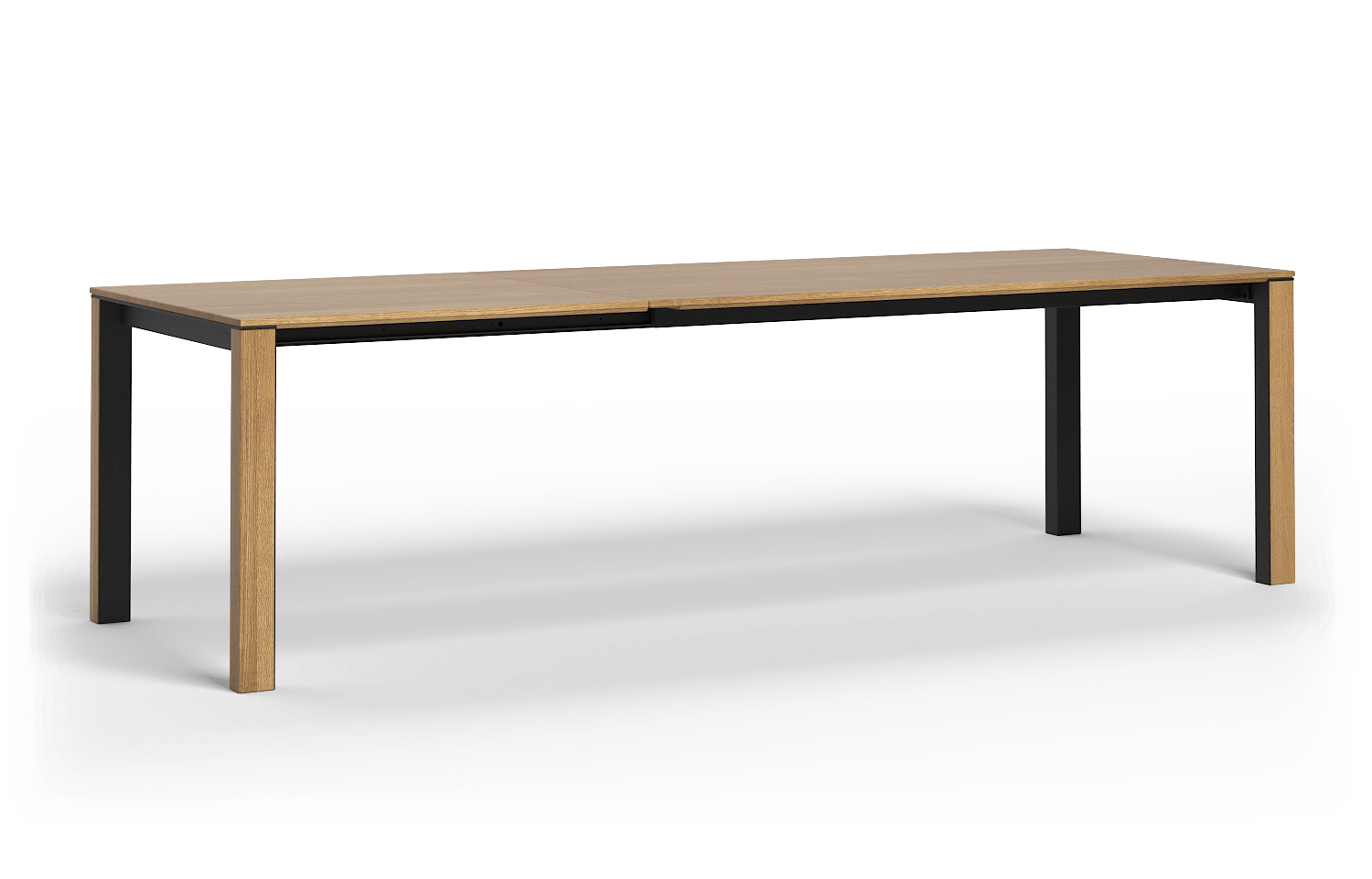 Herzstück dieses Tisches ist das innovative Aluauszugssystem mit Flachmechanik. Es fügt sich mit nur 50 mm Zargenhöhe sehr dezent unter die Tischplatte ein und sorgt für eine herausragende Beinfreiheit – ein echtes Komfort-Plus, das auch Armlehnenstühlen optimalen Raum bietet. Die lichte Höhe unter der 25 mm starken Massivholzplatte beträgt lediglich etwa 80 mm unter Tischhöhe – damit ist großzügiger Sitzkomfort garantiert.