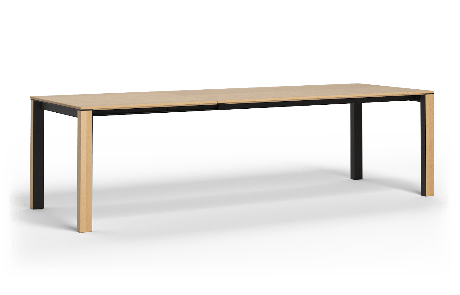 Herzstück dieses Tisches ist das innovative Aluauszugssystem mit Flachmechanik. Es fügt sich mit nur 50 mm Zargenhöhe sehr dezent unter die Tischplatte ein und sorgt für eine herausragende Beinfreiheit – ein echtes Komfort-Plus, das auch Armlehnenstühlen optimalen Raum bietet. Die lichte Höhe unter der 25 mm starken Massivholzplatte beträgt lediglich etwa 80 mm unter Tischhöhe – damit ist großzügiger Sitzkomfort garantiert.