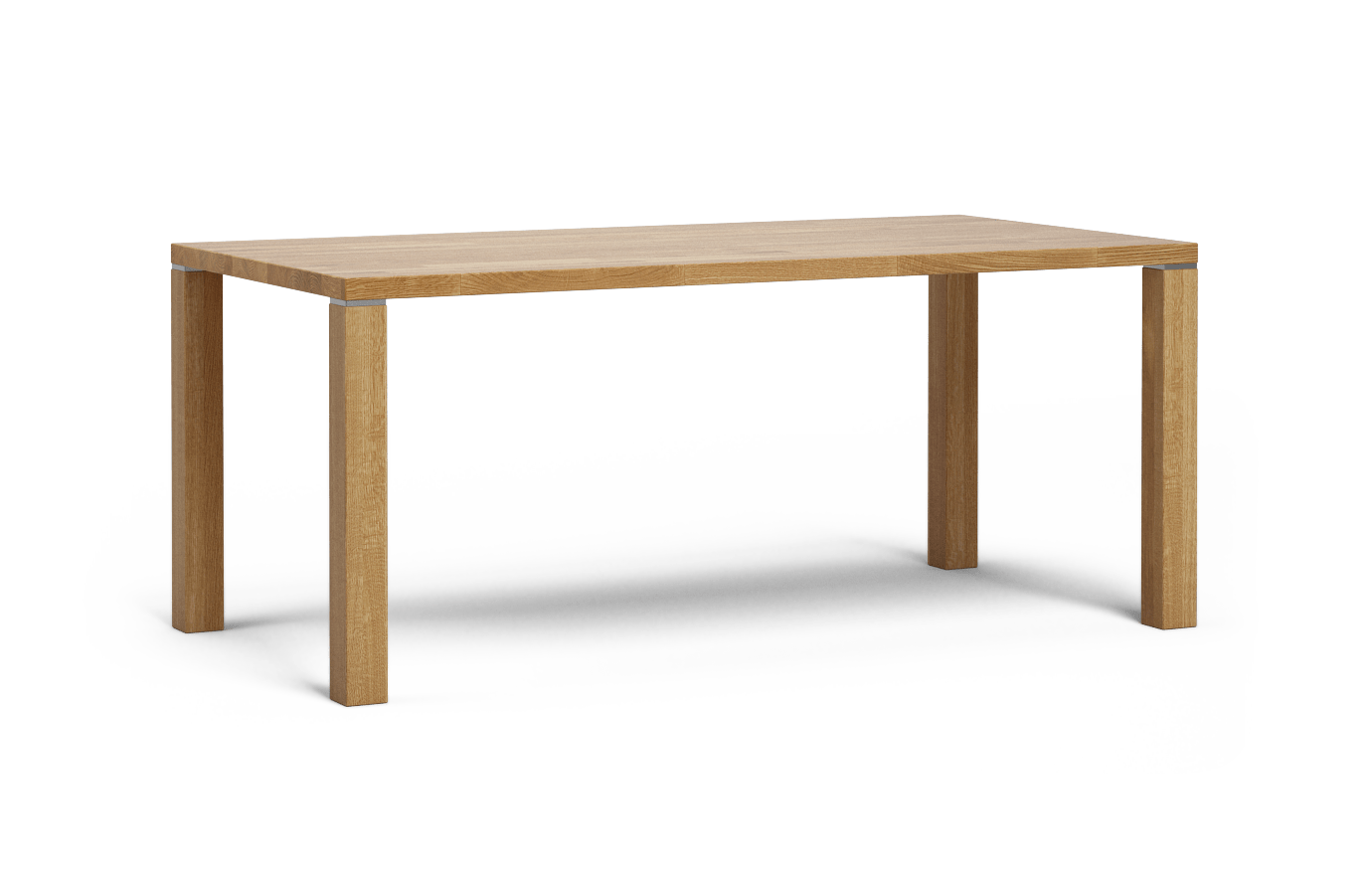 Der Esstisch ET02 erinnert in visueller und struktureller Hinsicht an unser Modell ET01. Ein Unterschied springt jedoch schnell ins Auge und bestimmt sogleich das äußere Erscheinungsbild des zargenlosen Esstisches. Zwischen den Beinen, die direkt an der Tischplatte montiert werden, ist eine ca. 1 cm starke Edelstahl-Distanz optisch integriert. Diese folgt einem etwas kühlerem, pragmatischem Gestaltungsansatz und setzt einen interessanten, bald kontroversen Kontrast zu dem sonst naturbelassenen Massivholztisch.