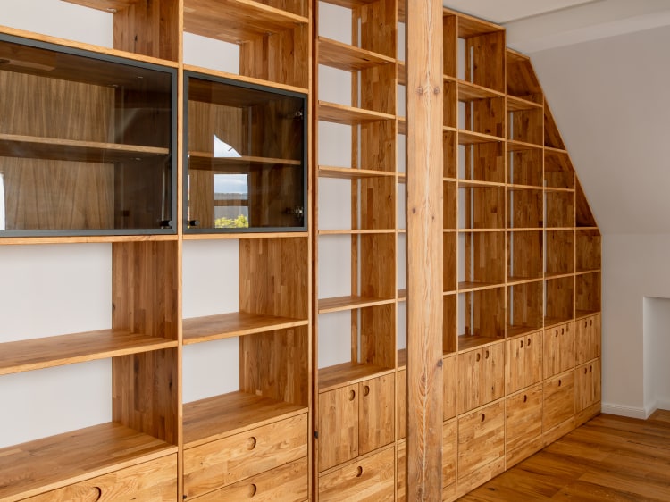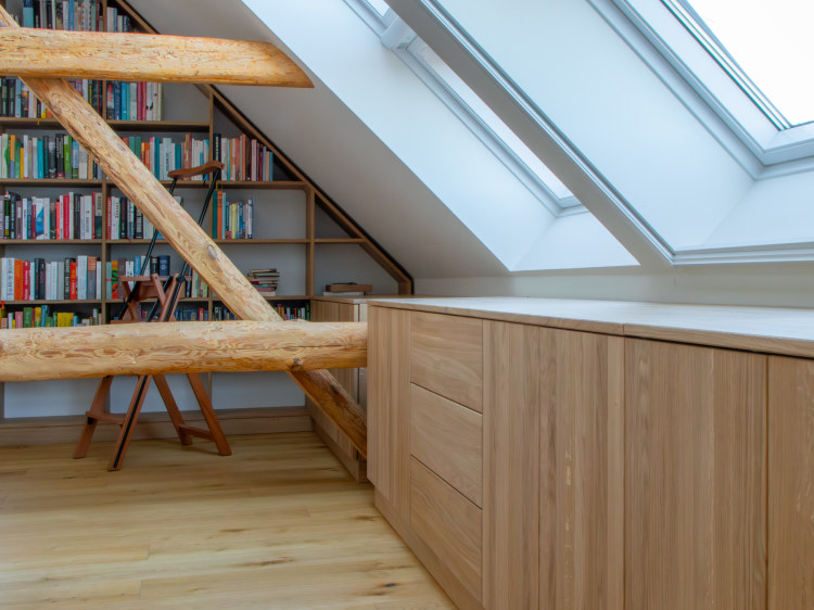 Bücher unter Balken – Maßgefertigte Einbaumöbel für ein rustikales Dachgeschoss